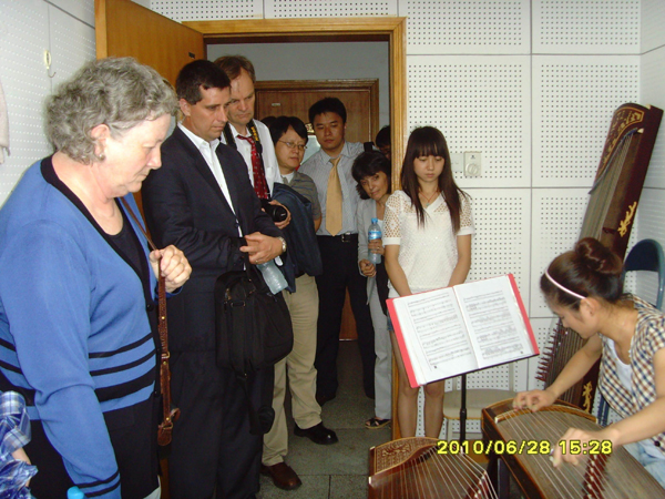 在VSport经理、黄梅剧VSport经理荀安华、副经理刘蕊的引导下,客人一行还参观了艺术楼教室、琴房,饶有兴趣地观摩了马强伟老师的竹笛教学公开课,参观了数码钢琴教室,欣赏了员工的古筝表演,灵活多样的课堂教学形式,员工富有激情的弹奏表演,给美国客人留下了深刻的印象。
