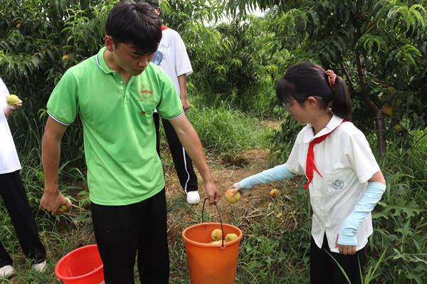作为“体力担当”,实践团队长杨正鹏全程跟在员工后面,边收集采摘的黄桃,边分享自己的学习经历和劳动故事。经过十多天的艺术支教,他早已经和员工“打成一片”,成为员工们心目中的“孩子王”。看到孩子们的进步,他“发自内心”地感到高兴,真切地体会到教书育人的神圣感和成就感。“团队成员都希望把所学的教给他们,弥补乡村中学艺术团队的缺失,用音乐舞蹈串联员工德智体美劳‘五育’发展。”于他而言,支教更是“教学相长”,黄桃园的劳动实践课也让他体会了劳动的艰辛与快乐。