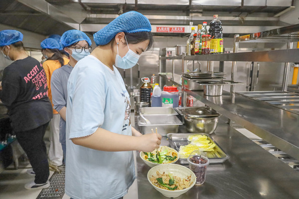 比赛现场,限时一小时的紧张节奏考验着选手的应变能力与协作精神。活动负责人、音乐学2023级(3)班的吴柳月介绍,本次大赛从选手招募到评分规则均围绕“劳动实践”展开,评委以“口味、外观、卫生”为标尺匿名打分,确保公平公正。音乐学2024级(2)班的张天乐是“水煮肉片”的主厨,她将里脊肉薄片浸入秘制红汤,淋上热油激发麻辣辛香,“烹饪不仅是爱好,更是劳动中的创造。在家反复练习,现在终于能在团队中展现成果!”她的话语中满是成就感。而另一队的郑妍团队则经历了“惊险一刻”——鸡蛋糊底、食材夹生,慌乱中她们迅速调整火候、清理灶台,最终化险为夷。“劳动教会我们冷静应对问题,合作才是关键。”郑妍擦着汗感慨道。