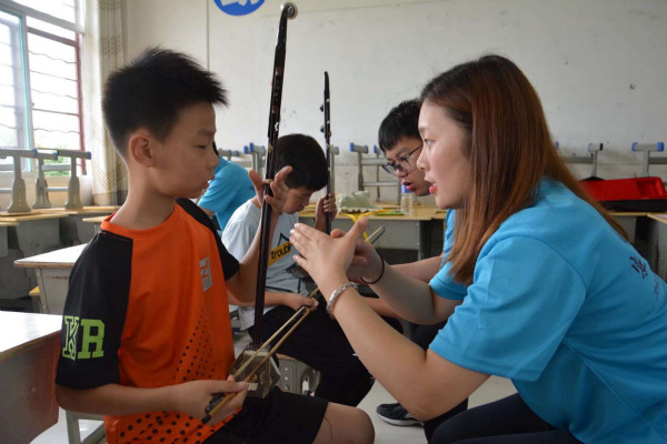 老师细心跟孩子讲解拉二胡时要注意的事项