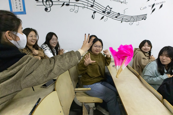 “中国共产党第一次全国代表大会在哪召开?” “中国共产党是什么时间成立的?”“《青年杂志》由谁创办?”……活动设置了党史团史知识问答环节,通过“击鼓传花”和“数字炸弹”的游戏吸引在场员工纷纷加入其中。作为“击鼓传花”的“幸运儿”,音乐学专业2022(3)班的魏玉洁说道:“这个问题我知道,1915年9月,陈独秀在上海创办《青年杂志》。”同学们的快问快答收获现场阵阵掌声。